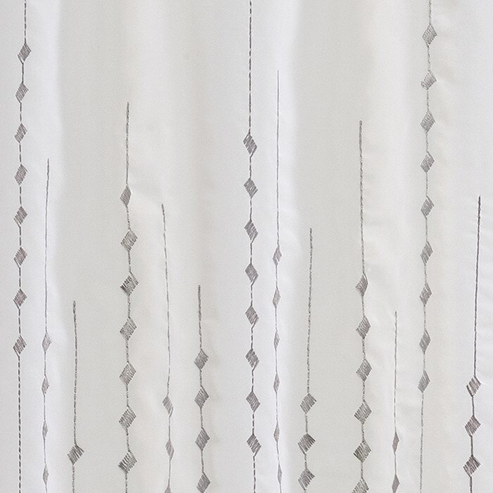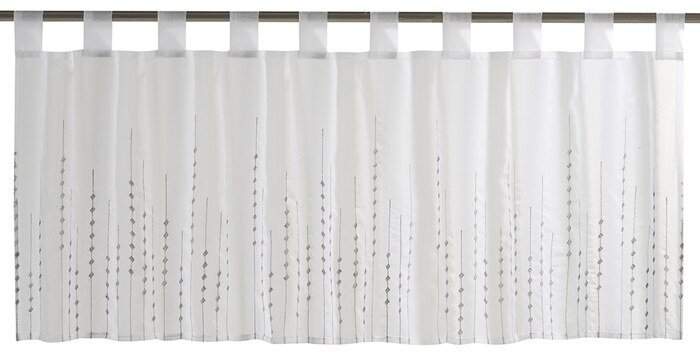 Graue Längsstreifen verlaufen vom unteren Rand bis zur Mitte und sind mit kleinen Quadraten bestickt. Das schöne Muster kommt auf der weißen, transparenten Scheibengardine gut zur Geltung.