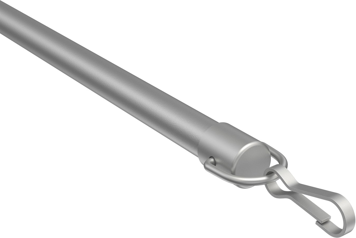 Am oberen Abschluss des Schleuderstabes befindet sich ein Ösenhaken, welcher einfach an den Schleuderwagen der Gardine oder in die Schleuderöse des Paneelwagens eingesetzt werden muss.